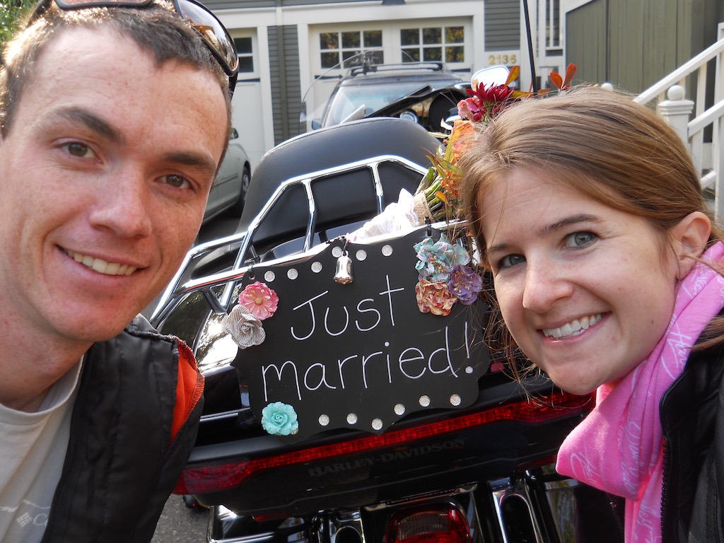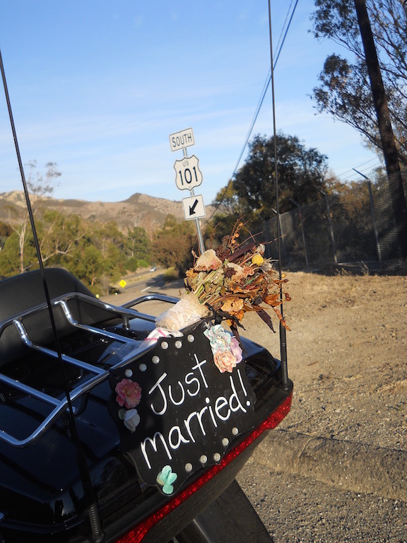 Jon and I woke up early and went down to the beach to pick a great spot on the sand to watch the sun come up. It was so fun to be so close to the ocean for all these days. So many great memories to choose from. Before returning the bike we gave it a bath and washed off all of the bugs and dust that we picked up on our 1600-mile adventure. We drove to the little airport at Santa Barbara where a friend of Adam’s Harley Davidson dealership was arriving to ride the bike back to Texas. Un-packing all of our stuff from the bike, taking down our “Just Married” sign and ‘guardian angel’ bell, and removing my flower bouquet from the luggage rack was so very sad. We handed over the keys and drove back to the hotel in a rental car – and I cried. bah! 🙁