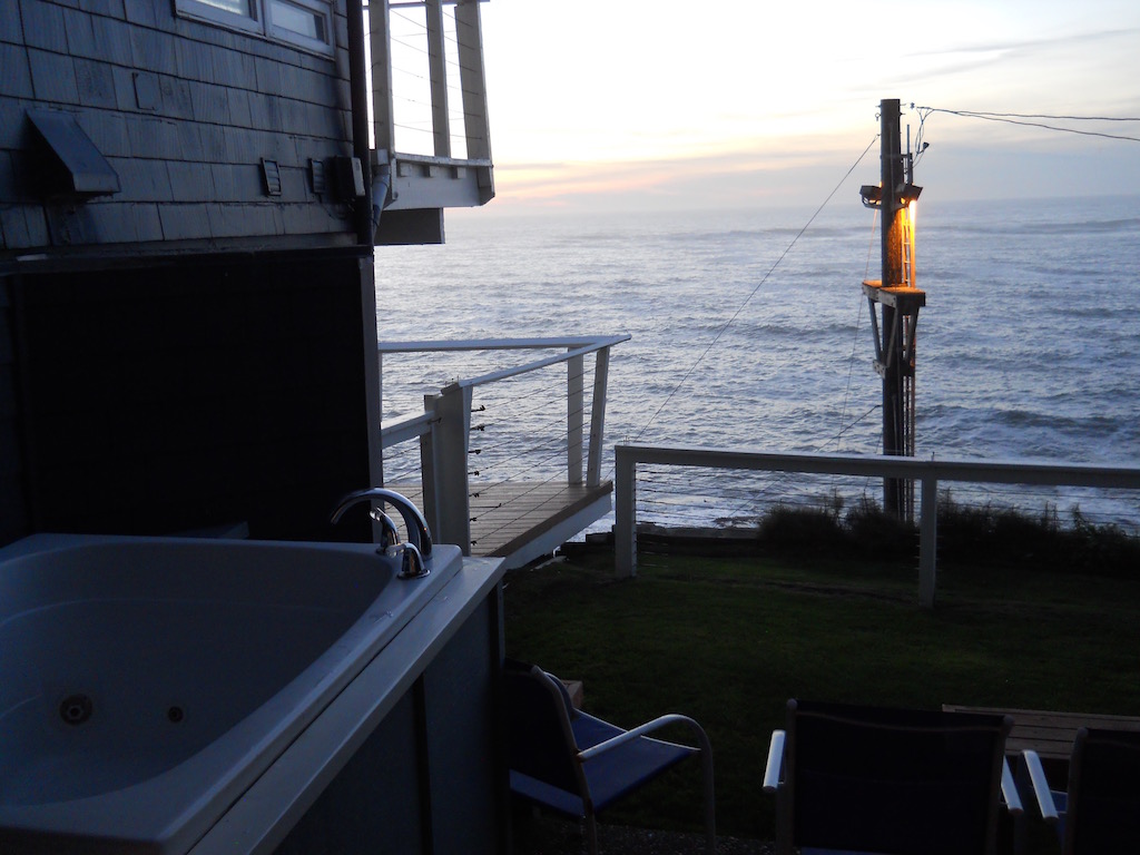 Back on the road we finally made it to the ocean! We headed south on the 3 Capes Scenic Drive and cruised along beautiful lush surroundings. Just as the sun was starting to set into the Pacific Ocean we arrived at out destination for the night in Depoe Bay. The hotel we stayed at here was called Charter House and was definitely a favorite on the trip. Our room was called ‘Spouting Horn’ and was incredible. Upon arrival to our room there was a fire lit, romantic music playing, chocolates on the pillows and the best note labeled: “Dearest Mr. and Mrs. Cosgrove” yay! The highlight of this room was a giant bathtub outside on a private balcony looking over the ocean. Robes, slippers, bath salts, the moon… all quite perfect. We headed to Gracie’s Sea Hag for amazing crab stuffed salmon and some kind of cheesy seafood goodness Jon ordered and were so happy.