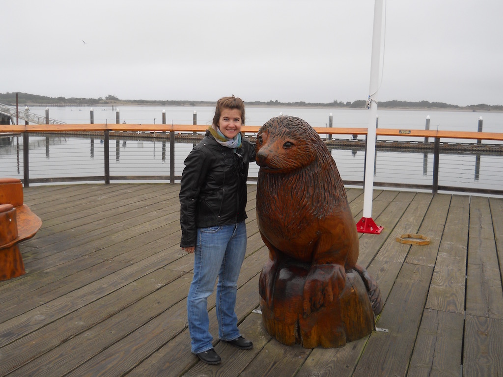 After my morning bath by the sea, we headed to the breakfast room for some breakfast by the sea. We were met by GIANT spread of really yummy foods… we were the only ones there so I guess they did it all for us! Packing the bike back up was always a challenge, how did we have so much stuff? Jon took a picture of me in my bedazzled “bride” sweatshirt and then it was left behind. It’s funny, we had to leave the white bride sweatshirt behind however Jon’s cheesy seafood leftovers found a place in the storage box…. This is the same cheesy seafood that would eventually leak all over my other jacket. yay. Today we headed for Bandon, Oregon. One of our stops for that day was to explore some of the sand dunes. Harley Motorcycles do not like sand so it was a quick trip. In the middle of fog and drizzle we arrived at our Airbnb in Bandon quite chilly. Our host was very sweet and had hot tea and blankets for us which were perfect after being on a bike all day. For dinner we headed into the small town and had another fancy seafood dinner – Halibut and seafood pasta. The Airbnb was private cottage that was built onto their house, it was very private and cozy. My personal favorite part of this particular B&B was the blue glass fish toilet seat 🙂