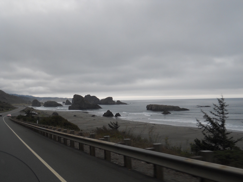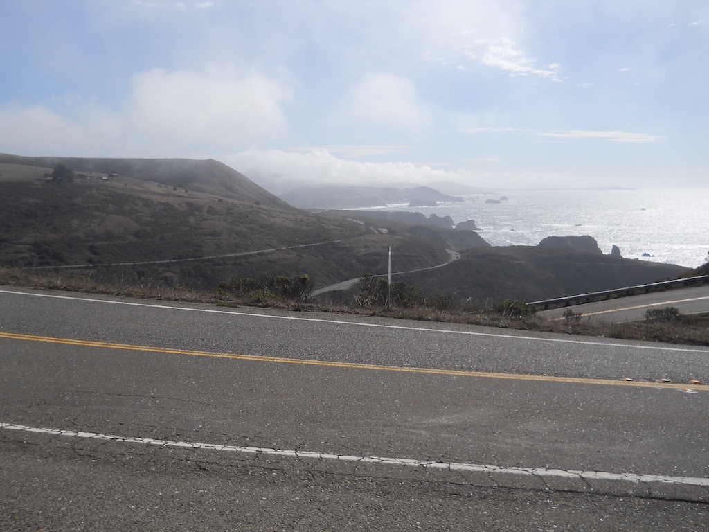 Thankfully the rain turned out to be fairly light and tapered off shortly after leaving the coffee shop in Garberville. At Leggett, just south of Garberville, Hwy 1 splits with Hwy 101 and heads generally West back to the coast over some small mountains. The hills here are densely spaced and the two lane highway was a challenge on the fully loaded big touring bike. Add in some light rain and areas of fog and this section ultimately was the most stressful and demanding from a riding point of view for me. Upon leaving Leggett, we saw numerous signs warning vehicles longer than 30’ to turn back due to tight corners and narrow lanes. Unfortunately, we still encountered numerous 35’+ Class A motorhomes which chose to ignore these rules. The combination of sharp turns and large setback between their front bumpers and front axle cause them to sweep the oncoming lane when navigating these turns and any of these turns could cause an ugly collision between these un-allowed RVs and an un-alert oncoming vehicle. I seem to never have my tack strips when I need them… Once back on the coast, the weather improved and blood pressure declined and we enjoyed more awesome riding along the coast.