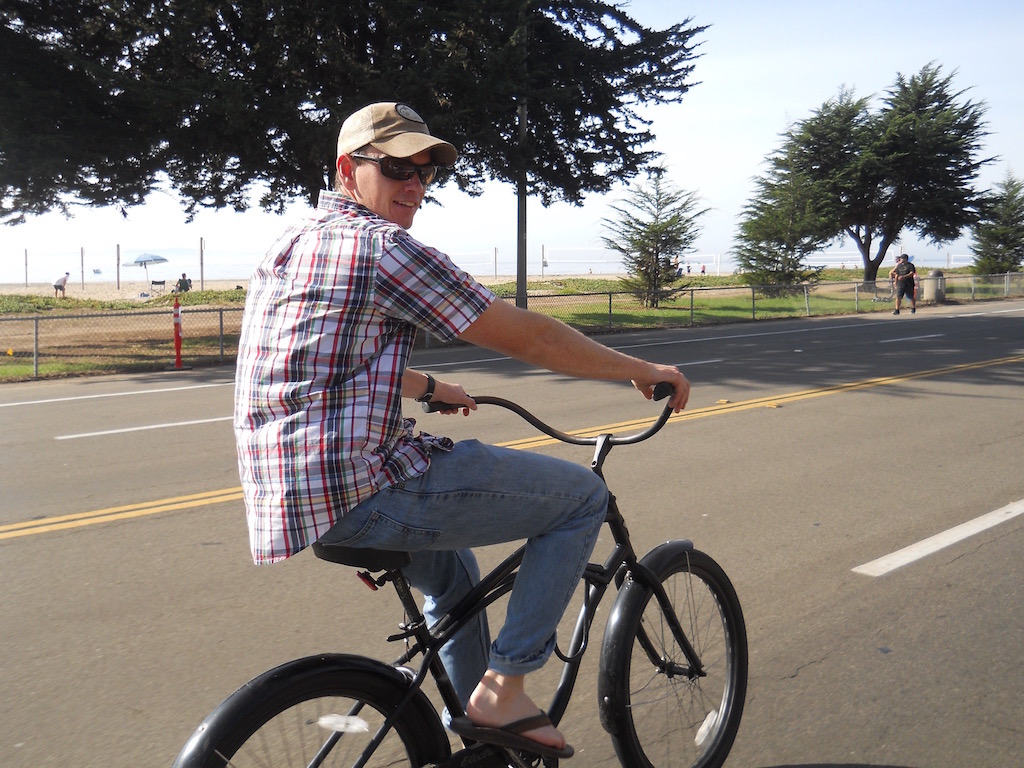 It was quite a break for Jon that he didn’t have to drive anywhere today! Instead of taking off on a motorcycle, we headed out on bikes today to explore the city. The bikes were in the crappiest condition ever – especially to an ex-bike shop master like Jon, and after we rode down a huge hill and realized they were horrible we didn’t want to waste time to go and return them so we just carried on. Our Mr. & Mrs. Cosgrove bike tour led us to the Golden Gate park and then to the coast where we saw a Coast Guard helicopter rescue team practicing next to surfers catching some waves. We climbed more steep hills and had our crap bike chains pop off so many times that once we actually made it to the bridge we couldn’t wait to get off the bikes and WALK across the bridge. It was very cool to appreciate the greatness of the bridge and how huge it is. On our way back to the hotel we stopped at “The Long Now” headquarters that seconded as a bar. The Long Now is a group that is promoting long term thinking and thus is building a clock that will continue to tick for 10,000 years – Jon read a book about this project so we of course had to check it out! I was also intrigued and now want to read this book. The bike ride home was not enjoyable as by this point the bikes were pretty much disintegrating as we rode them, plus we got lost. Once back at the hotel, what better way to get away from all the frustration from the bikes than to go to the roof top patio for some afternoon tea? While sitting outside with our drinks Jon swears that he saw a bright green parrot fly by. I didn’t see this parrot, but after a little research we found out that there is actually a flock of parrots living in San Francisco… huh! who knew!