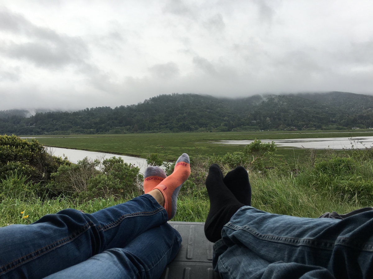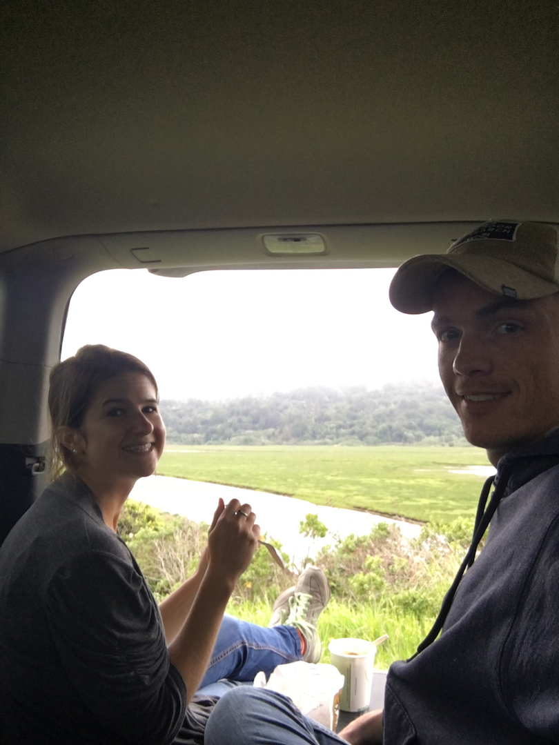 After an afternoon caffeine boost, we headed North from the city across the Golden Gate. Our plan was to find a place to camp along the Coast, then surf near Bodega Bay on Sunday. Knowing there wouldn’t be easy, established camping in the area, we had planned to travel light and sleep in the Element for the night. This meant no stove or campfire, so we stopped in Point Reyes Station for some deli counter chicken noodle soup before continuing on to find a good ‘campsite’. Just a few minutes North of town we lucked out and found a great spot by Tomales Bay where we ate dinner and ended up spending a peaceful night with good views and lots of bird activity. While relaxing that evening we spent a while discussing how busy and noisy life in San Jose seems to be, and we were both feeling recharged by the good scenery and clean air. Our night in the Element went much better than the first attempt in Tahoe. This time we were sans air mattress and this actually provided more room and meant we weren’t sinking down toward the middle of a deflating airbag all night.