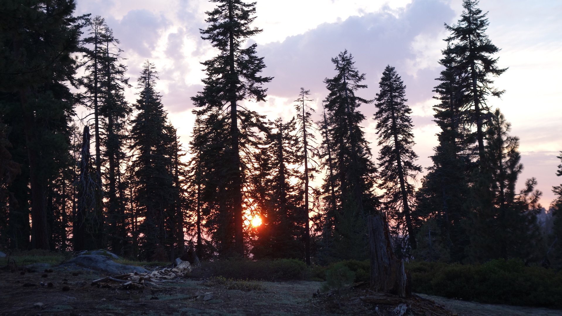 Around 5pm we were both overheated, tired and hungry, and the clouds which had been building all day began producing frequent thunder. While we were aiming to reach El Cap for the night we decided to make camp for about a mile from the summit. Megan looked exhausted and I was beat myself so it was the right call. We both felt much better shortly after a rest and some food, and setup a nice camp off the trail in a sheltered stand of trees. I built a quick fire and we spent the rest of the evening relaxing, reading, and watching an incredible sunset thanks in large part to all the smoke in the atmosphere.