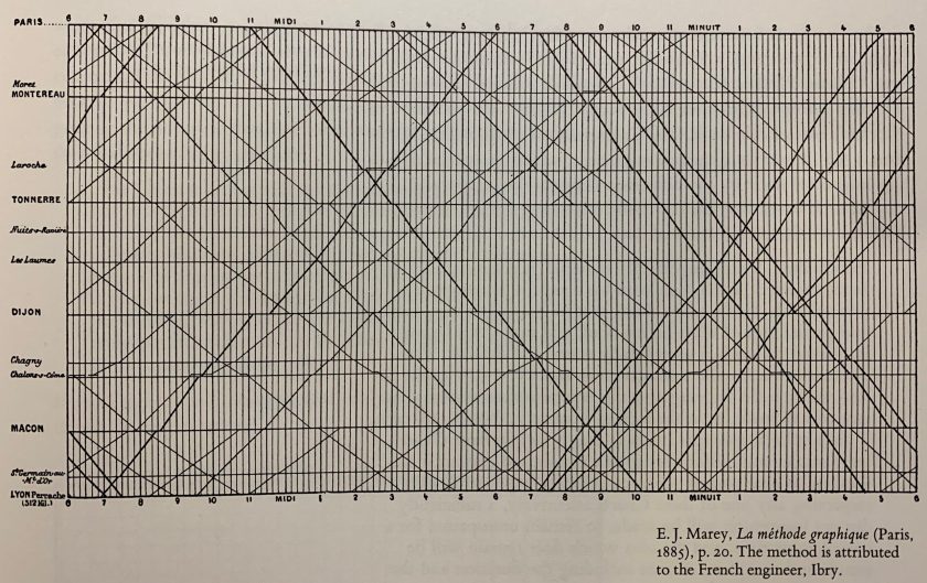 One graphic in particular held my attention, possibly since Tufte repeatedly uses is as a reference to describe some good or bad characteristics of data graphics. It is a train schedule from long ago showing the routes and time tables for travel between Paris and Lyon.