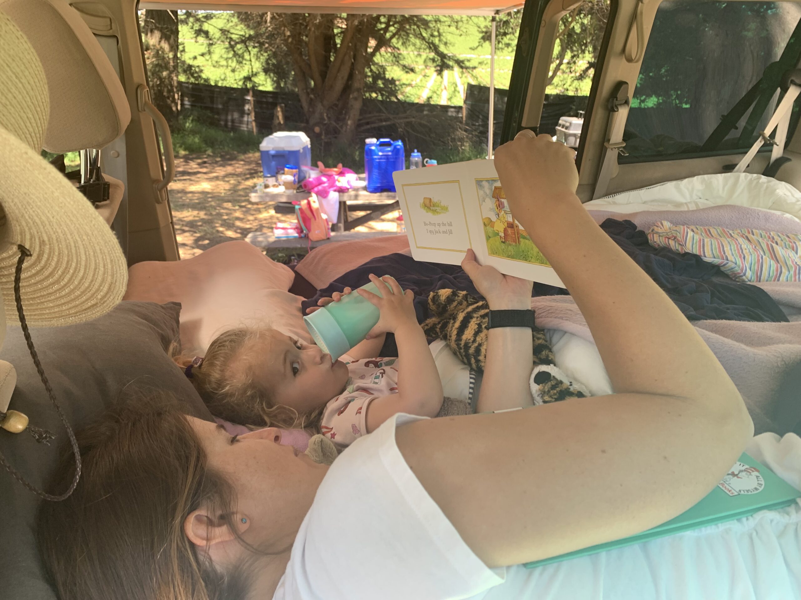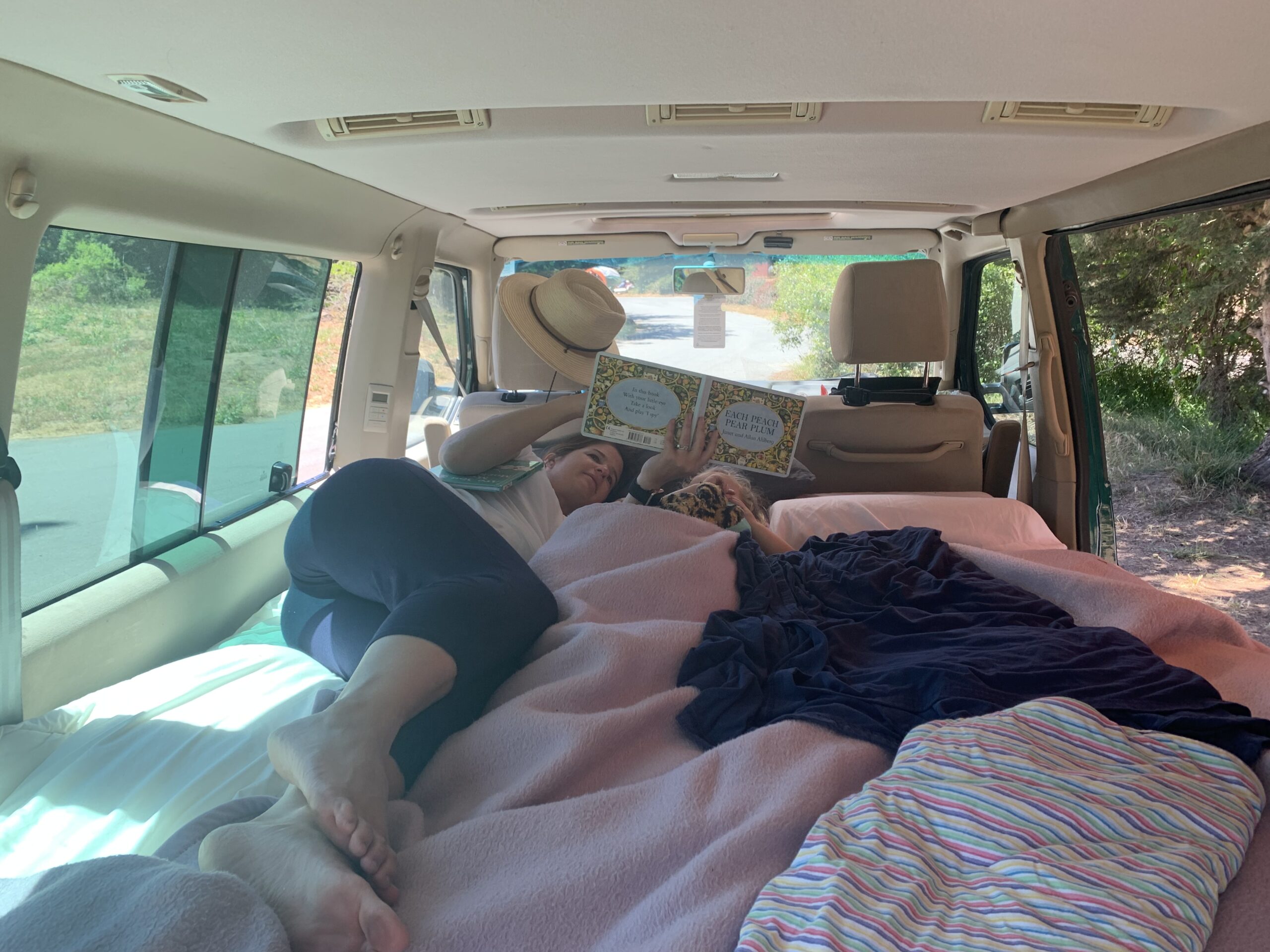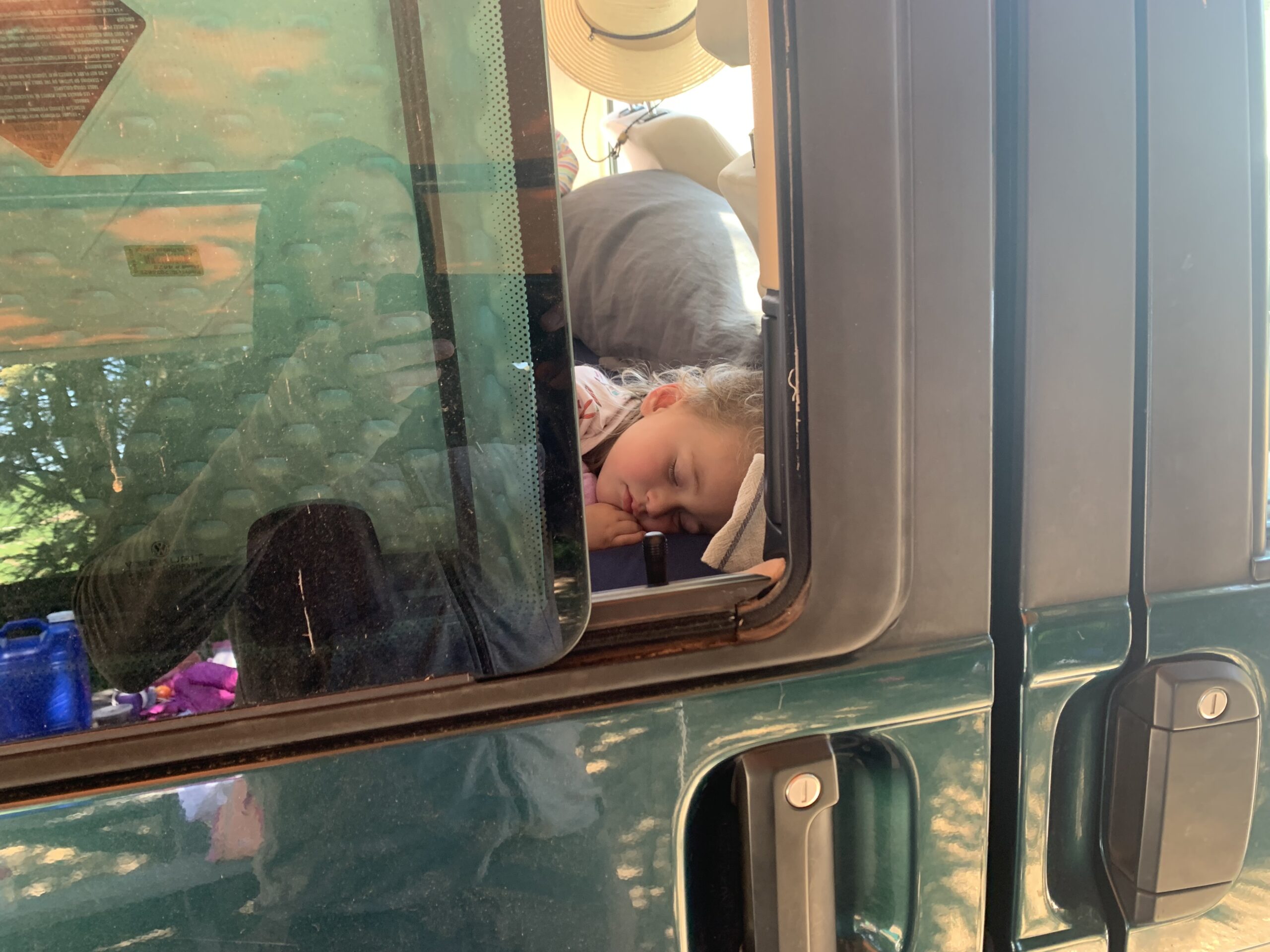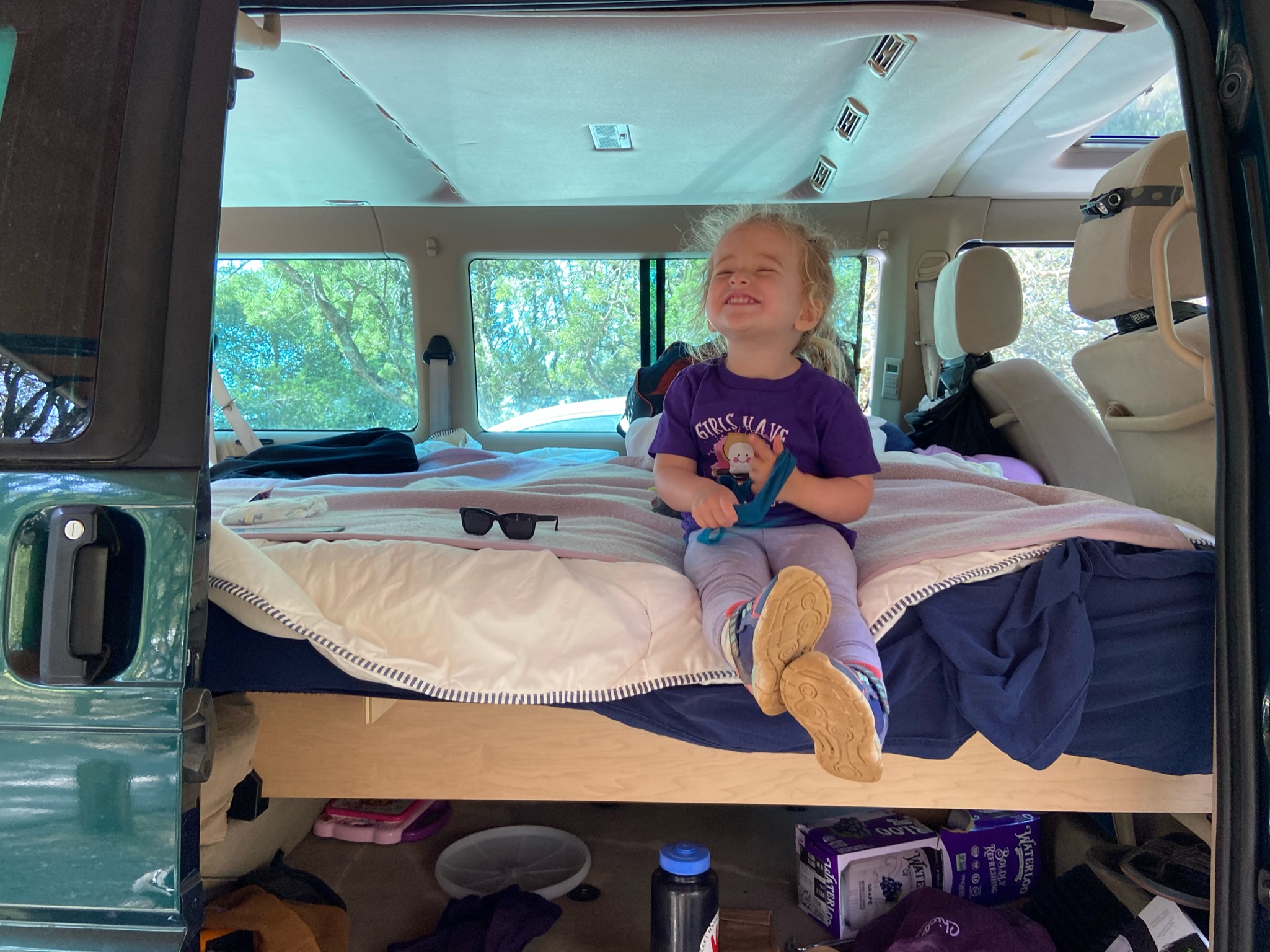 For this trip we invited Carlos and Laura and their son Sebastian. We thought we had booked two separate sites which wasn’t the case but our site was big enough to accommodate both parties without any issue. This was our first trip using the bed platform I built for the van and it worked out great. Jane (and I) had a comfortable place to nap in the afternoon and at night we all slept pretty well. During our one full day without travel we took the kids out for a bike ride while the girls went for a hike and generally just hung out and relaxed in camp. We saw a good sunset both nights which was a treat for Jane and we all went to bed kind of early.