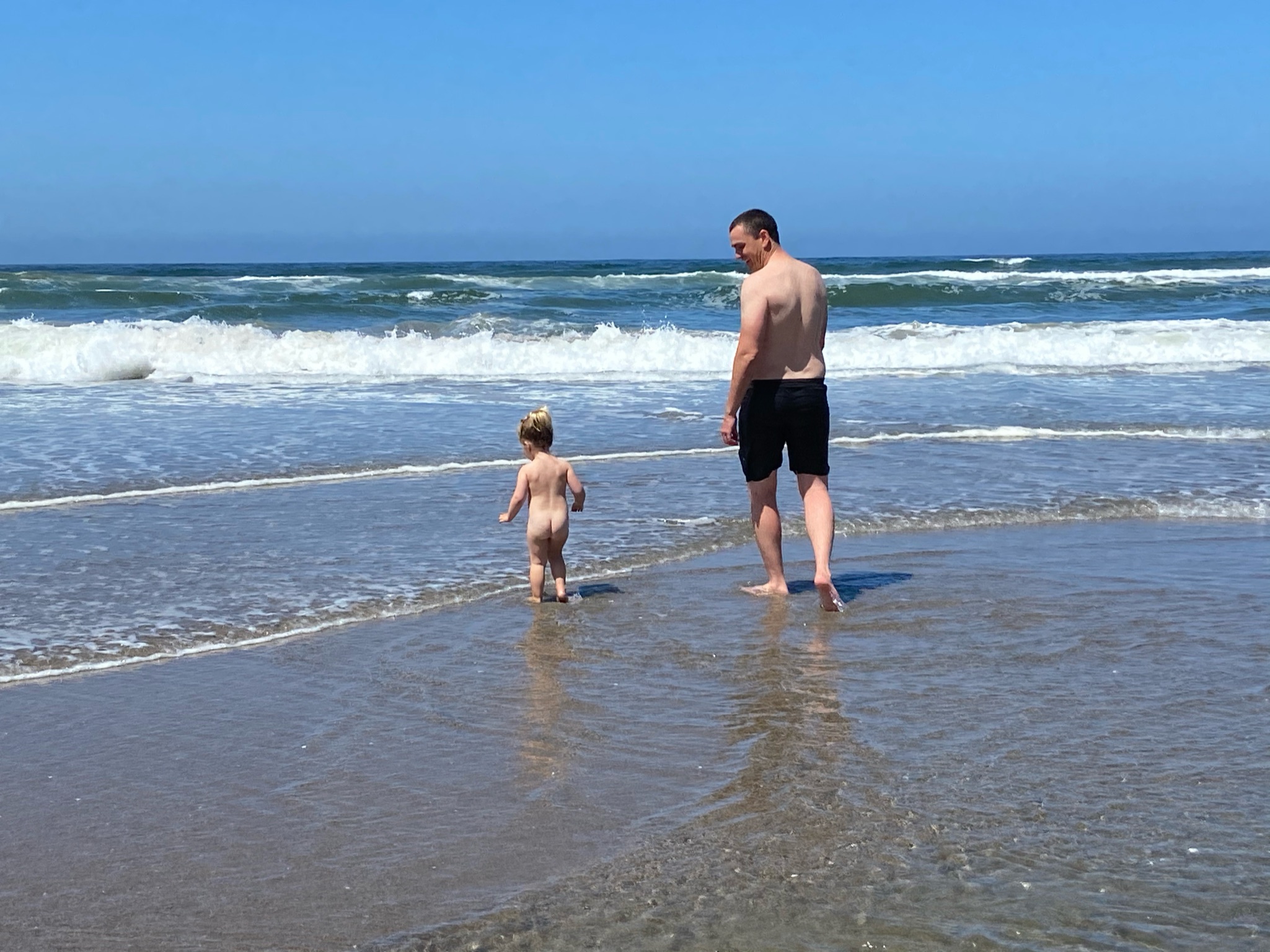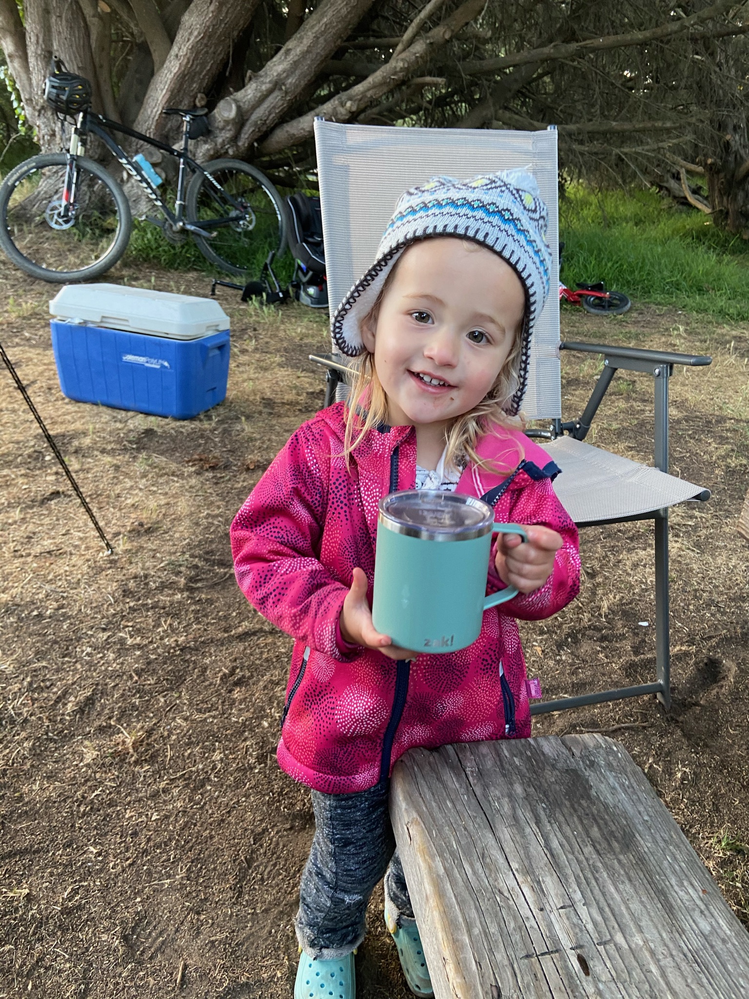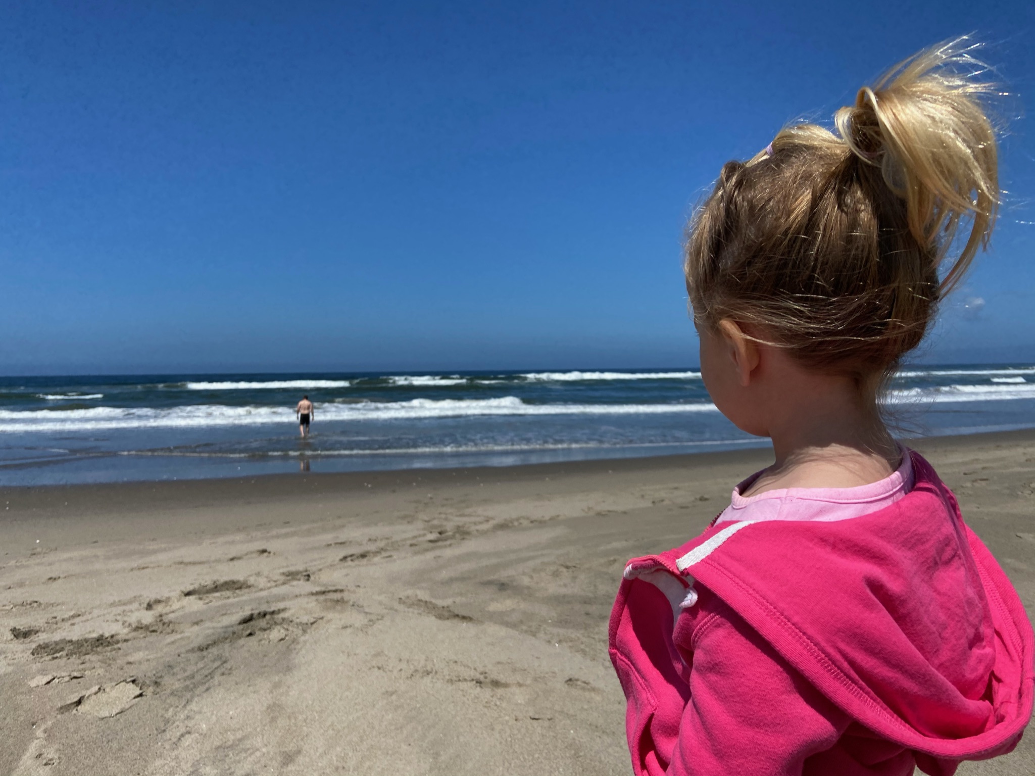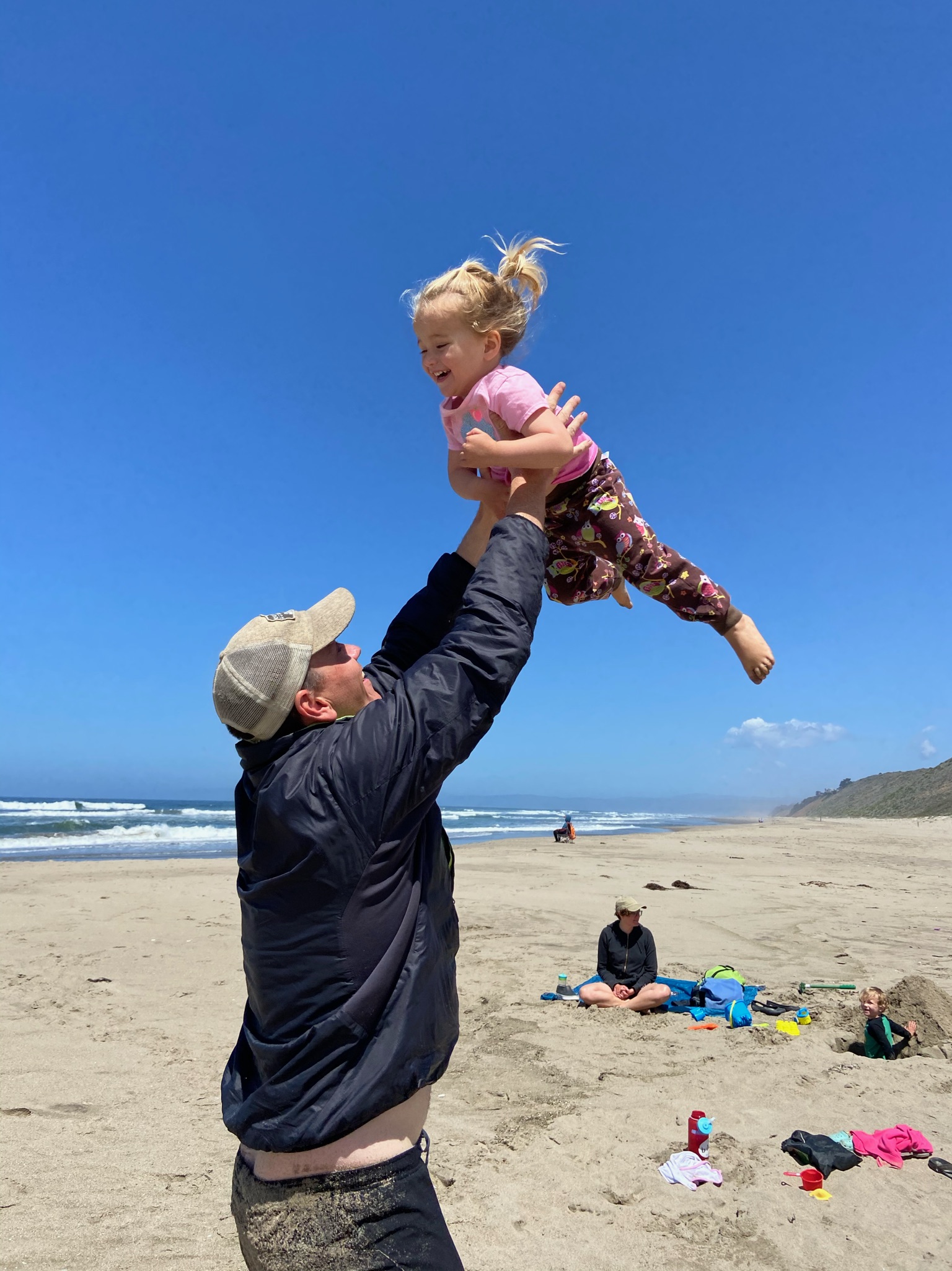 The wind quickly built that afternoon and the beach very near a sand storm, so after about 45 minutes digging holes and climbing on the life guard tower without anyone else around, we hiked over the hill back to the relative shelter of camp. Sunset beach didn’t have the campfire restrictions that we encountered at Mount Diablo so we built a fire and had a relaxing evening in camp and after dinner, we all walked back over the hill to watch the sunset over the ocean. Jane remembered from Mount Diablo that the sun goes to bed and then the moon gets up which I thought was great. For only being a two-year-old, she’s already had quite a few awesome sunsets over the ocean and a growing tally in the foothills too.