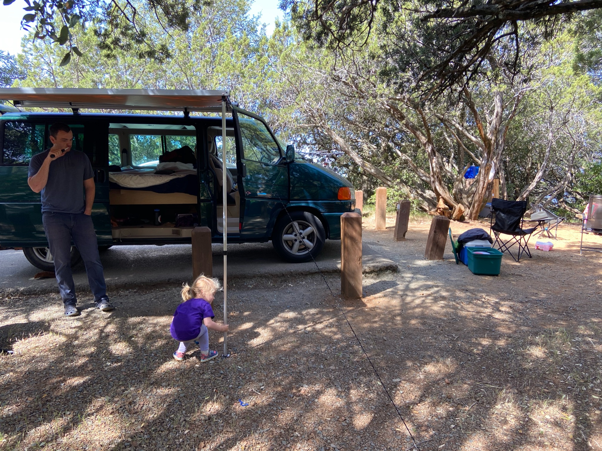 Our second trip was to the beach and cooler weather. We only had a two week gap between Mount Diablo and Sunset Beach but in the days leading up to our trip I was already really eager to go again because we had to had so much fun with Jane camping at Mount Diablo. For Sunset beach we had actually booked two sites, intending to offer one to some friends to join, and we ended up offering the second to our neighbors Rob and Kara across the street who have a four year old boy. We left San Jose at 10 AM on the dot which is funny because that has historically been the time that we leave when camping despite our desire to leave or either earlier or later. Wake up early and pack up camp? We leave at 10 AM. Sleep in late and enjoy the morning? We still leave at 10 AM. So this trip was off to a good start.