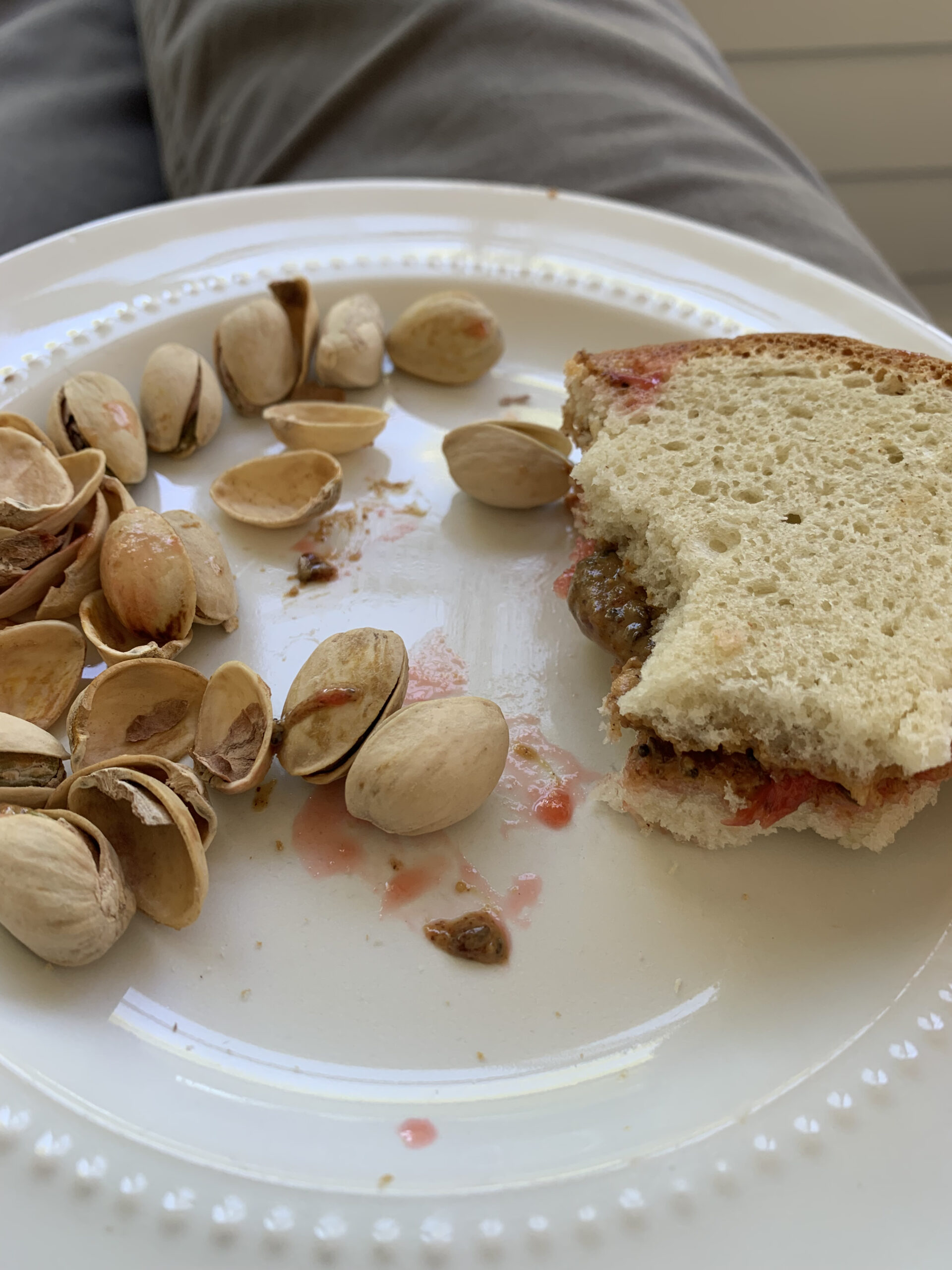 I ate 3-4 of the magic bars / cookies throughout the day and had a PB&J for lunch. The bread is very good, and the jam was strawberry which Kathy made on her recent visit. Its strawberry season and we got a case of them from a road stand coming back from the beach the other day. Our normal peanut butter has hydrogenated oil so that is out. In lieu I had some mixed nut butter we got from Costco a while back. Its very expensive ($15 / medium sized jar) and it turns out, way too runny for good sandwiches. As a side I had pistachios.