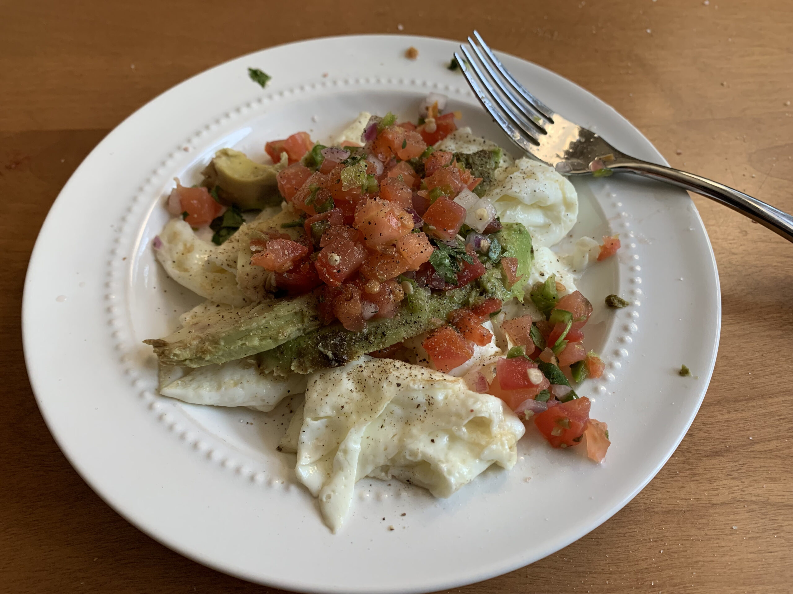 Eggs, pico de gallo, and avocado again for breakfast, I don’t really get tired of this combination.