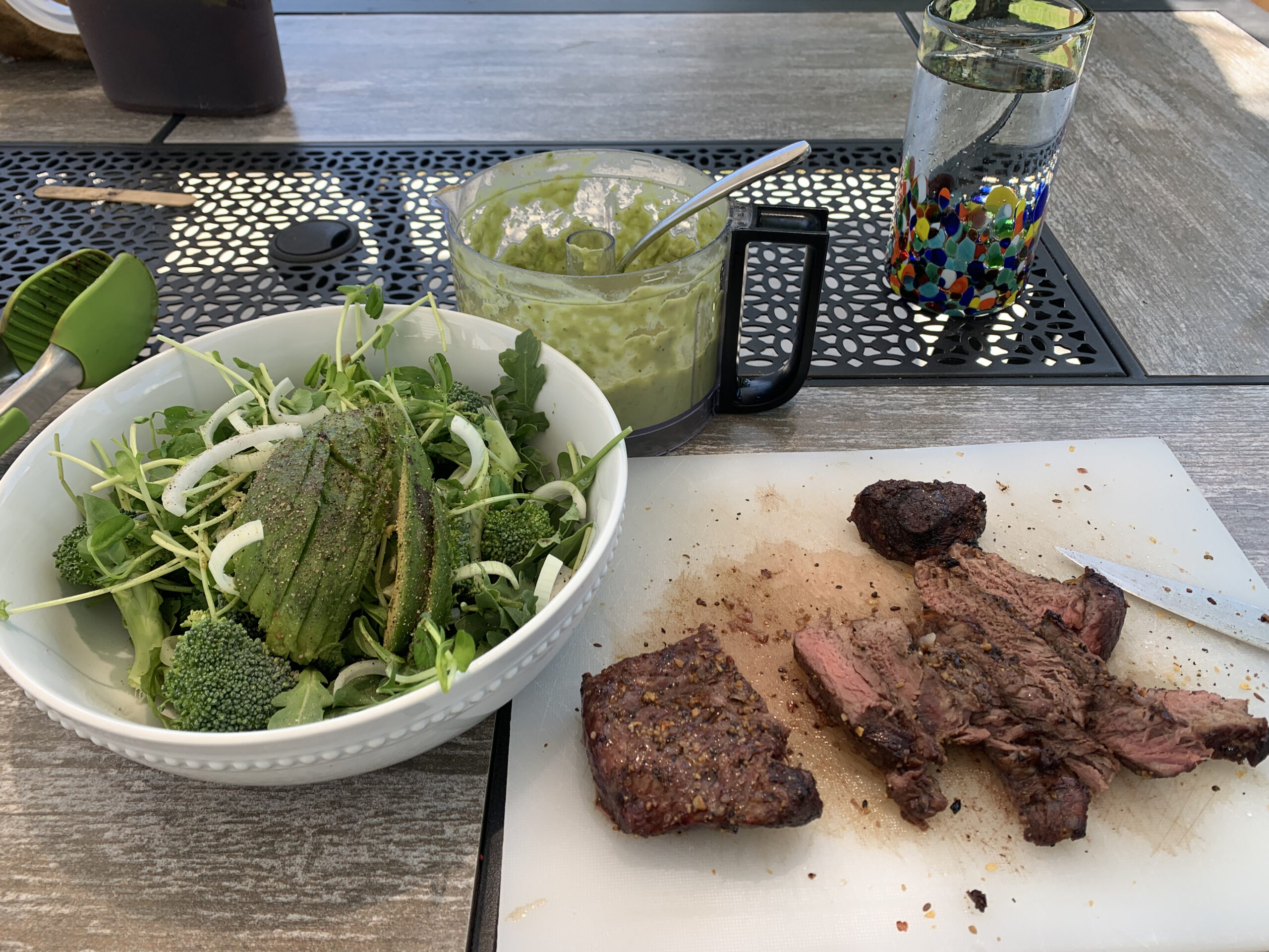 Grilled steak and arugula salad for lunch. Working from home has its perks. This was the first freshly grilled steak I’ve ever made myself during the workday. The salad was big with sprouts, arugula, broccoli, carrots, and some other random veggies. I surprised myself by avoiding the dressings in the fridge and whipping up the planned avocado dressing which I had failed to prepare the night before. It was a bit thick but very tasty and I’m glad I made it.